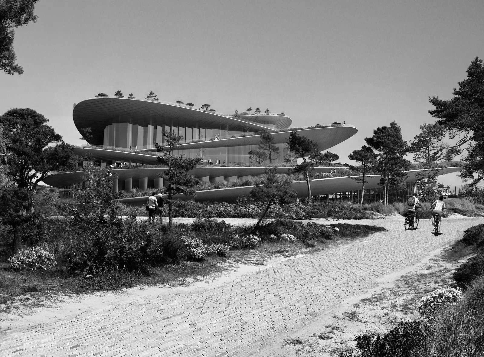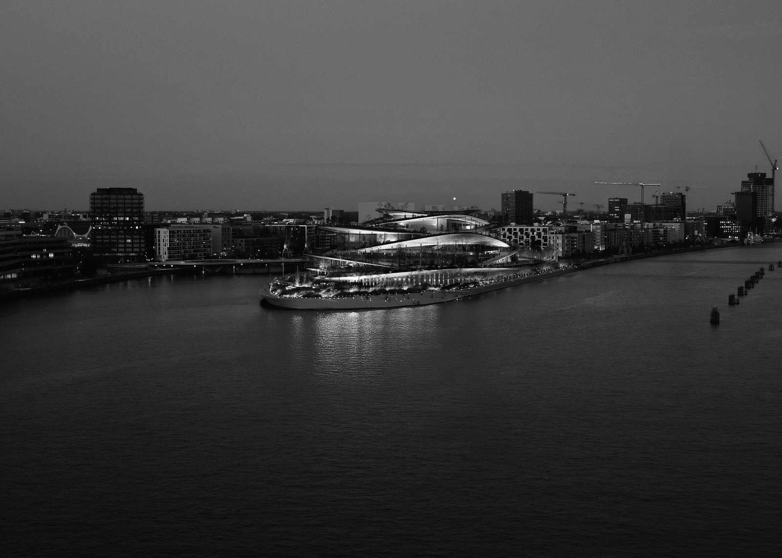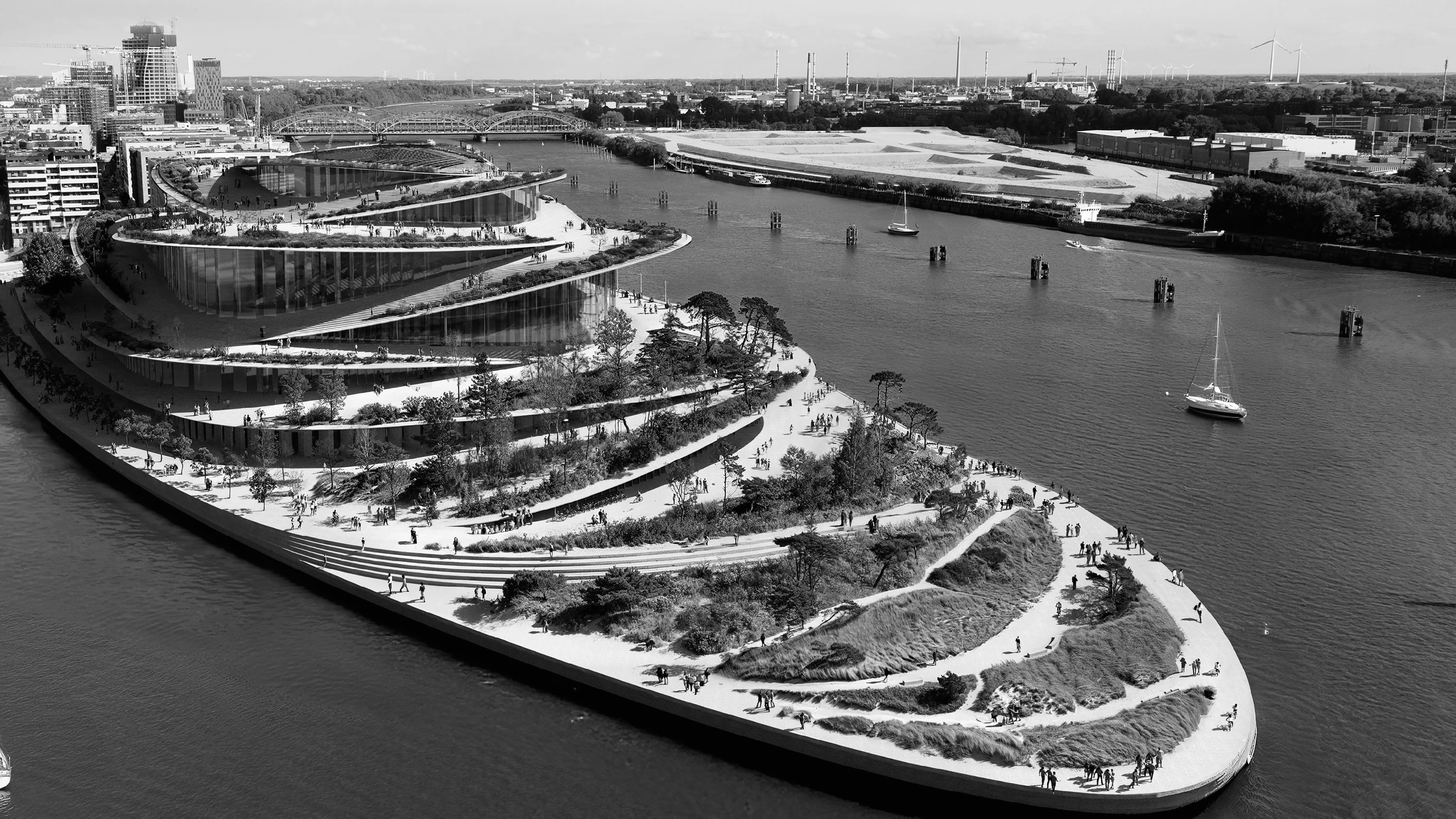 der dänische baukonzern bjarke ingels group hat jüngst das qualifikationsverfahren für den bau der neuen oper gewonnen2, mit einem entwurf, der mit seiner formsprache kaum aneckt, eine die ihre gleichgültigkeit der form zum ästhetischen prinzip erhebt; er bedient sich einer wirbeloptik, zutreffend für den standort einer landzunge, tatsächlich gibt es hier besonders starke hydrodynamische phänomene, während die ästhetik trotzdem gefahrlos bleibt; eben jene landzunge befindet sich auf dem historischen ort des baakenhöft auf exakt halber höhe zwischen elbtower und elbphilharmonie, denn ob es an dieser stelle eines weiteren leuchtturms bedarf, ist streitbar, schließlich liegt es an der stadt wahrzeichen zur kapitalisierung einer durch schifffahrt geprägten stadt zu schaffen; die visualisierungen der big wollen ein zu allen seiten offenes opernhaus mit aufzwirbelnder dachlandschaft zeigen, es soll schliesslich ein "architektonisch herausragendes gebäude mit hervorragender aufenthaltsqualität für alle hamburgerinnen und hamburger werden"3, ein gläsernes foyer, umgreifende parkanlage in einheitlicher zwiebelringsprache, die sich immerhin in der angularität von jenem entwurf für die prager philharmonie aus gleichem hause unterscheidet4; schlussendlich bilden jene minimal geneigten pfannkuchenscheiben ein gesamtbild, das einer fest vertäuten superyacht ähnelt und dem geldgeber somit nicht missfallen wird.